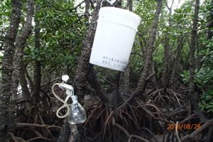 The activities we conducted varied greatly, depending on the study focus. One group was doing work related to remote sensing and habitat mapping (mainly Nakayama-san, Yamada-kun, Kominami-san, and Yennie-san, with Otsuka-san and Ikenaga-kun of Nadaoka Lab), which involved tasks such as aerial photography using Phantom drones, quadrat sampling to assess benthic cover, and sampling of both seawater column and sediment pore-water parameters. These were conducted mainly in Shiraho Reef, although drone flights were also conducted in the Fukido area. Another group was focused on the Fukido mangrove forest (mainly Ideura-kun, with Yoshikai-san and Kawasaki-kun of Nadaoka Lab), for which the main activities were the deployment of various standalone sensors, 24-hour and spatial sampling of soil pore-water salinity, mangrove tree density and species distribution measurements, and detailed investigations of mangrove root characteristics.